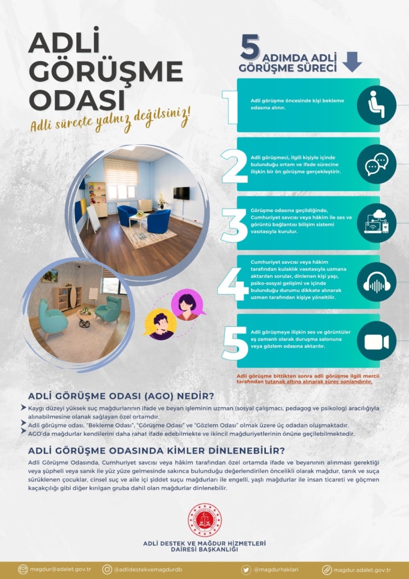 4- Hizmet sunumuna ilişkin standartlar geliştirilerek, vaka yönetiminin uygulandığı, adli görüşme odalarının kullanıldığı etkin bir sistem kurulmuştur. Çocuk ve Aile içi şiddet büroları ile tüm ceza mahkemelerinde uzman desteği sağlanmaktadır.